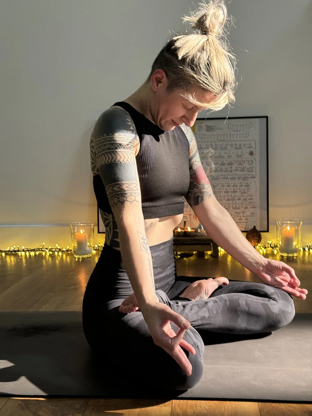 Agi Gazda practicing yoga in a meditative pose on a mat, surrounded by candles and string lights.
